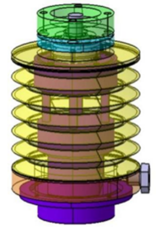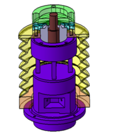 三分量应变天平主要结构包括(1)上连接件(2)螺杆(3)轴承端盖(4)三分量应变天平。中心为螺纹孔与螺杆相连接, 上面具有周向分布的螺纹孔及销孔用于与其他的装配体相连接。螺杆端与上连接件相连接,安装孔的下面是四柱梁的天平元件,元件上粘贴应变计, 并组成电桥,以便进行横、侧向力的感知测量。在四柱梁的下方具有剪切梁元件结构,在该元件上粘贴应变计,进行纵向力的感知测量。 三分量天平的最下端同时具有周向分布的安装螺钉孔与销孔,用于与其他的装配体相连接。三分量天平外侧采用波纹管进行密封防护。